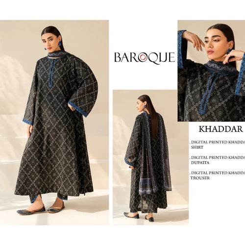 Baroque Luxury Winter Khaddar Printed Unstitched 3 Piece Suit – Premium Printed Khaddar Shirt, Trouser & Dupatta | Elegant Winter Collection 2025 for Women.